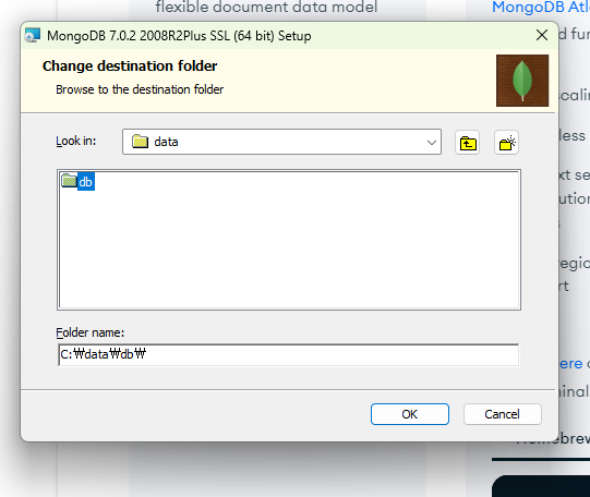 C:\data\db\ 를 찾아 선택하고 OK를 클릭합니다.