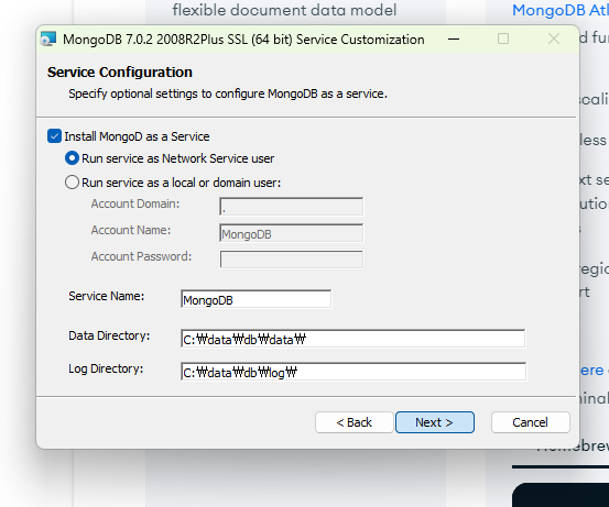 Location 항목이 C:\data\db\ 로 변경된 것을 확인하고 Next를 클릭합니다.
