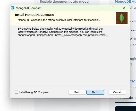 Install MongoDB Compass 선택을 해제하고 Next를 클릭합니다.